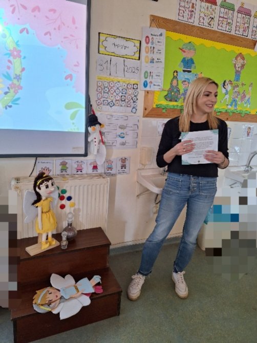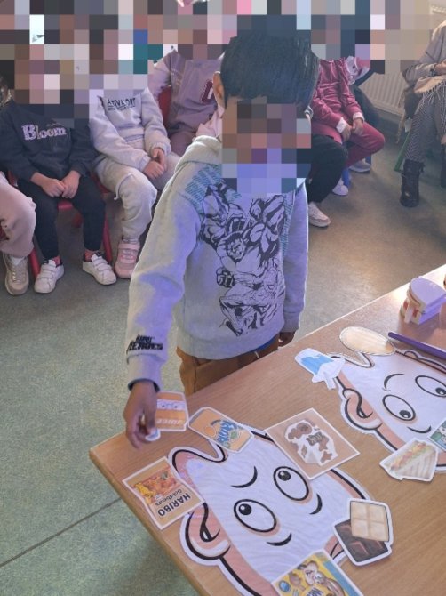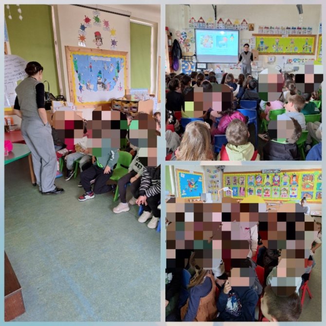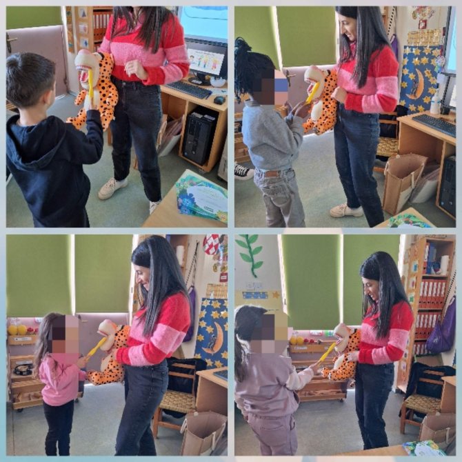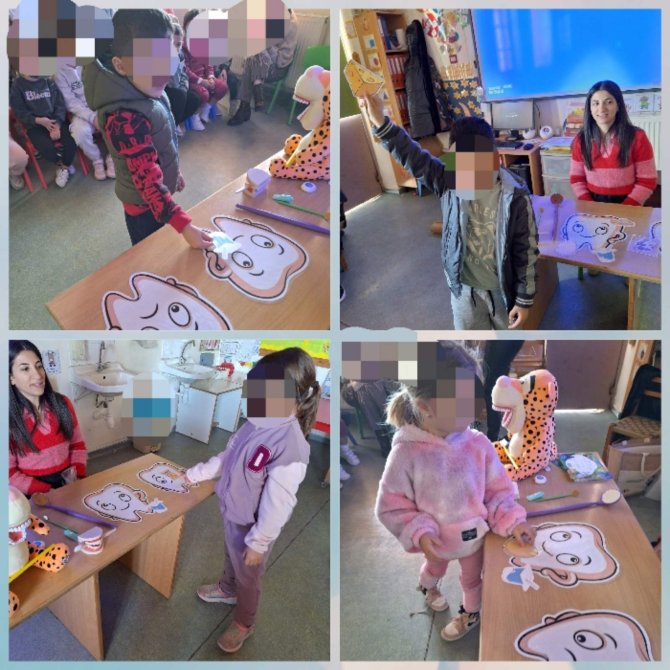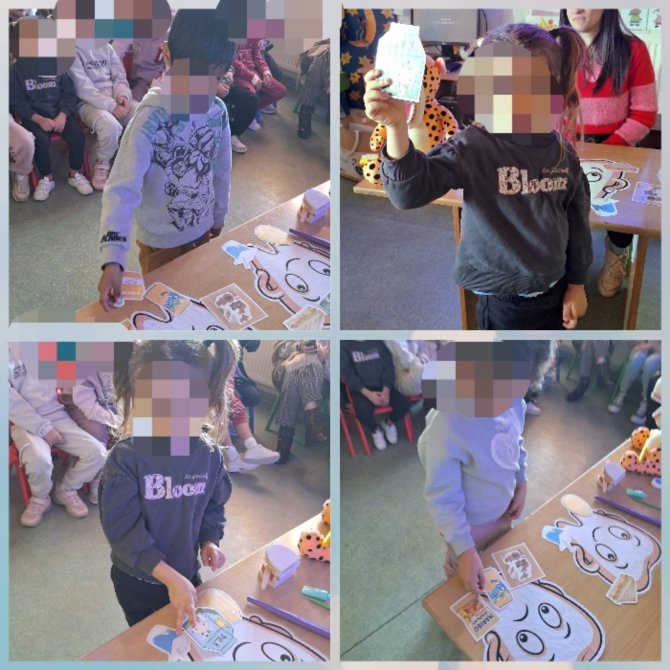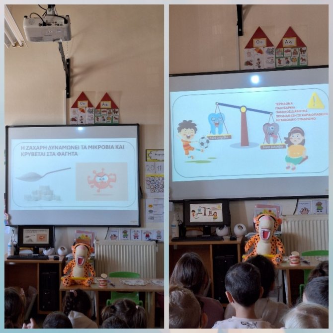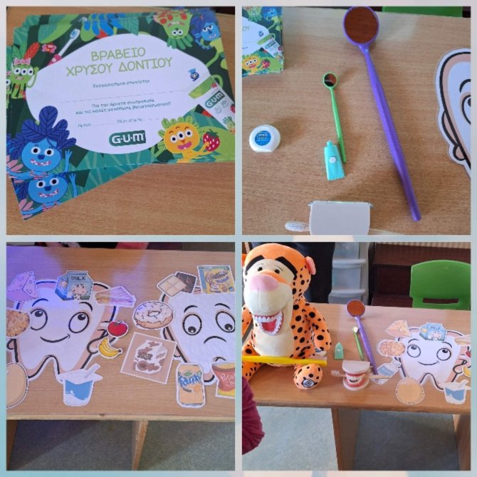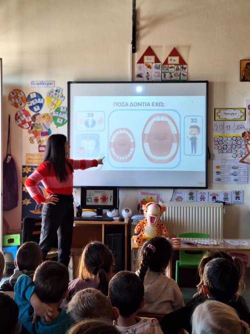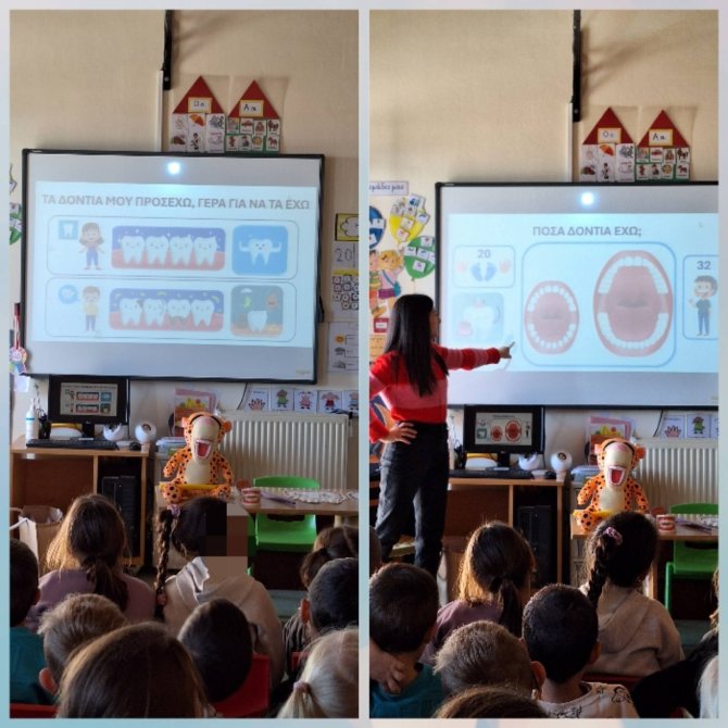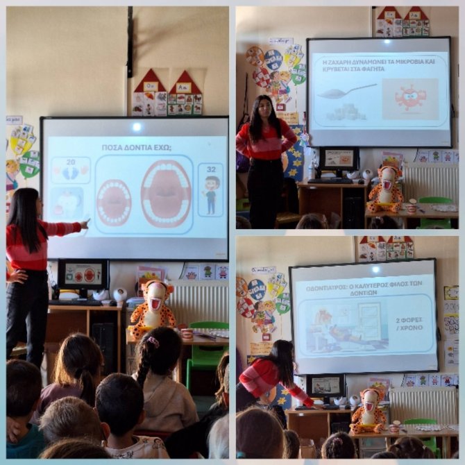 Στη σημερίνη της επίσκεψη η οδοντίατρος μίλησε στα παιδιά για το πόσο σημαντικό είναι να φροντίζουμε τα δόντια μας έτσι ώστε να είναι υγιή και γερά. Για να το πετύχουμε αυτό επισήμανε στα παιδιά ποιες τροφές επιτρέπεται να τρώμε και ποιες καλό είναι να τις τρώμε σε μικρότερη συχνότητα ή και να τις αποφεύγουμε εντελώς. Επίσης εξήγησε στα παιδιά πώς πρέπει να βουρτσίζουν τα δόντια τους και πόσες φορές την ημέρα πρέπει να τα πλένουν αλλά και κάθε πόσο πρέπει να επισκέπτονται τον/την οδοντίατρό τους.