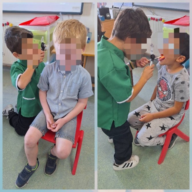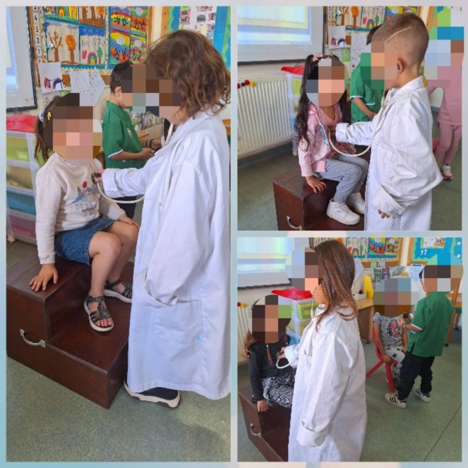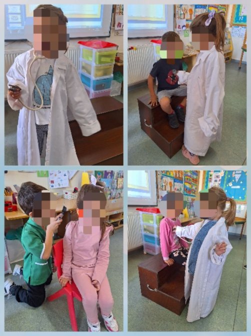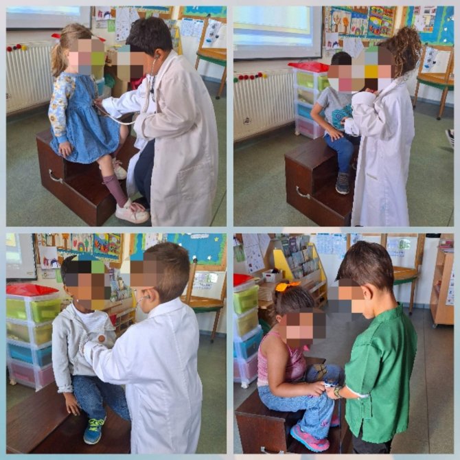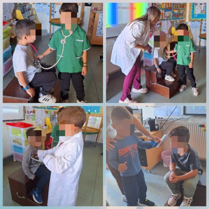 Στα πλαίσια της επεξεργασίας του project Aγωγή Υγείας επισκέφθηκε το σχολείο μας η γενική ιατρός Μαρία Ακουρσιώτη η οποία μίλησε στα παιδιά για το επάγγελμα του γιατρού. Τόνισε ότι είναι πολύ σημαντικό τα παιδιά να τρέφονται σωστά από αυτή την ηλικία αλλά και να προσέχουν και να προστατεύουν τον εαυτό τους από τα μικρόβια. Οι απλές καθημερινές συνήθειες σωματικής υγιεινής θα πρέπει να αποτελεί αναπόσπαστο κομμάτι της καθημερινότητας τους και της προσωπικής τους υγείας. Τα παιδιά είχαν την ευκαιρία να μιλήσουν μαζί της, να δουν από κοντά κάποια από τα ιατρικά εργαλεία ενώ δεν έχασαν την ευκαίρια να γίνουν για λίγο "ιατροί" φορώντας την άσπρη ιατρική ρόμπα και με το στηθοσκόπιο, το ωτοσκόπιο, το θερμόμετρο και άλλα εργαλεία εξετάσαν εξονυχυστικά τους "ασθενείς".